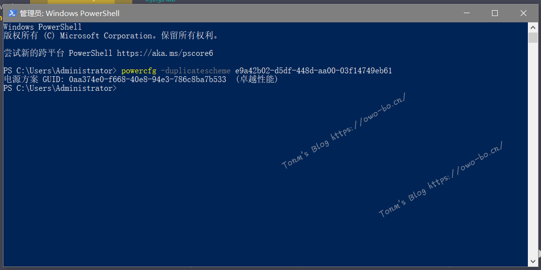 然后,在 Windows PowerShell 窗口中输入命令执行:powercfg -duplicatescheme e9a42b02-d5df-448d-aa00-03f14749eb61