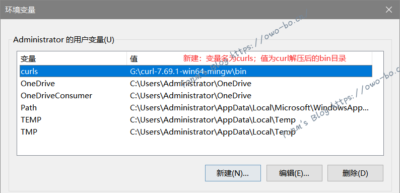 (2)新建用户变量,变量名为curls,值为文件curl解压后的bin目录