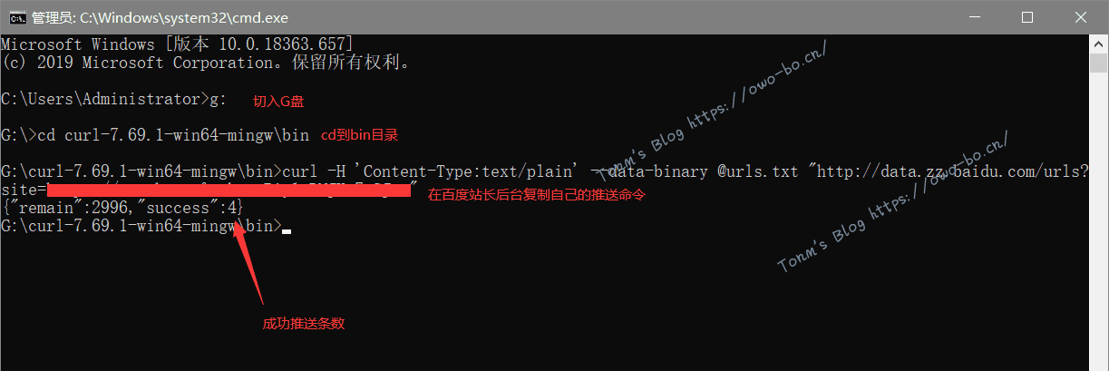 (3)将百度站长平台的接口地址粘贴到命令提示符的窗口内