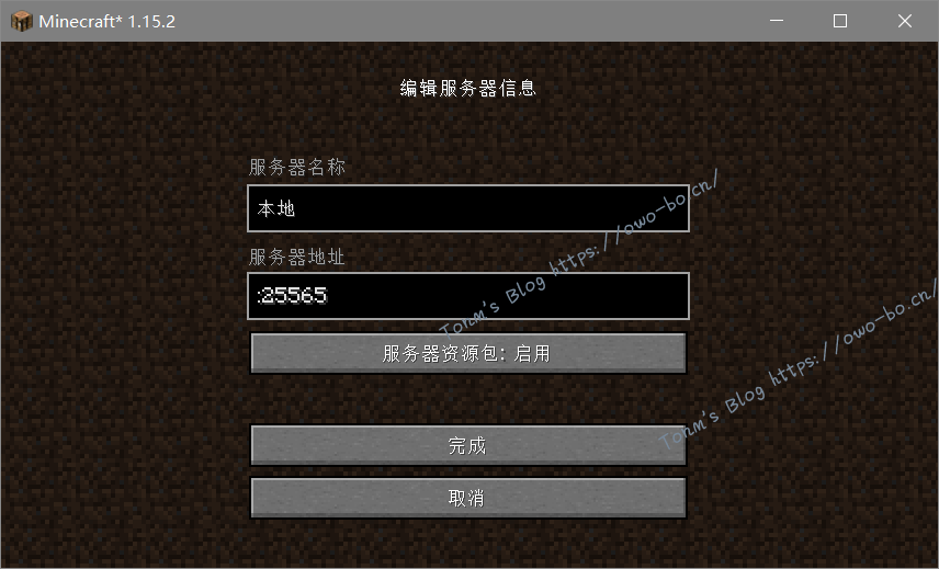 先确保是否正在运行服务端文件server.jar,然后在打开本地的客户端,点击【多人游戏】-【添加服务器】,如果没有修改过端口参数,端口就默认设置为:25565,点击完成后就能加入服务器了