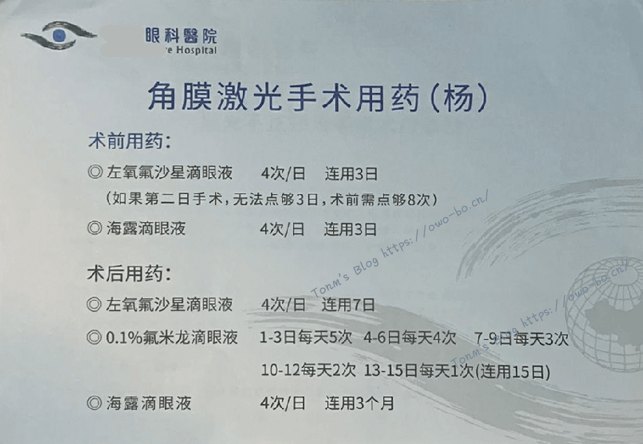 一个月后我来到医院复查,发现没啥问题,所以我和医生就预约了4月30号做全飞秒激光手术,本来是想预约5月1号的,但是医生和我说五月一号的手术排满了,所以我往前推了一天,刚好下午人不多医生就给我排上了,不得不说五月一号预约手术的人还是挺多的,还好预约了30号,术前医生会开两瓶眼药给你,一瓶是左氧氟沙星滴眼液,一瓶是玻璃酸钠滴眼液,一天四次,两种眼药每次间隔五分钟,在滴眼药的时候还要做定视训练防止你在激光的时候眼球乱动,乱动还是挺危险的,大概每次定个30秒左右,一边眼睛练个三次就可以